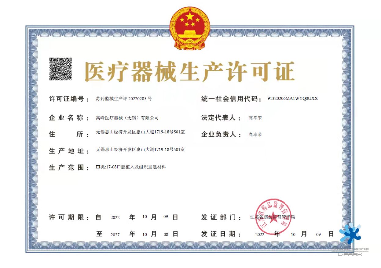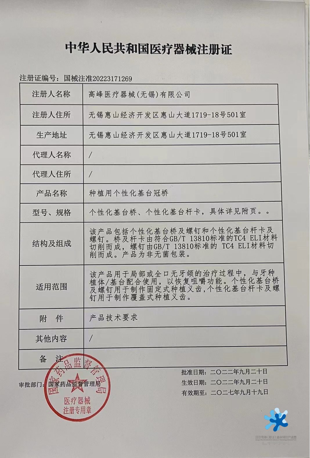 九月中旬,高峰醫(yī)療器械(無錫)有限公司獲得國(guó)家藥品監(jiān)督管理局頒發(fā)的“種植用個(gè)性化基臺(tái)冠橋”醫(yī)療器械注冊(cè)證,這是該產(chǎn)品國(guó)內(nèi)首張三類證,公司已同步取得生產(chǎn)許可證。