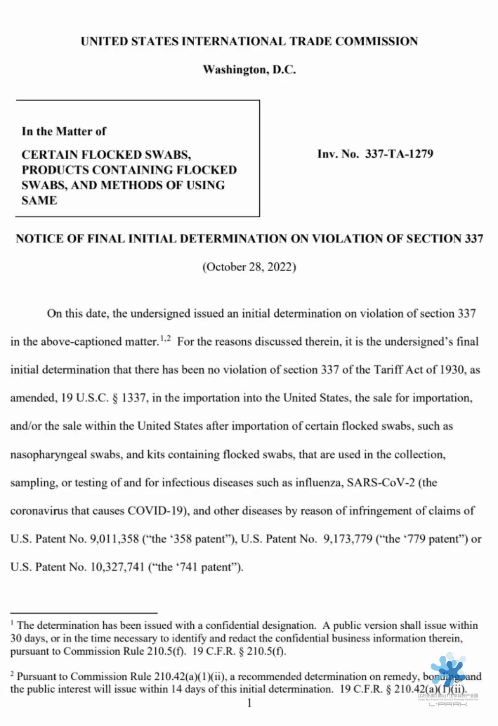 (美國(guó)華盛頓時(shí)間)10月28日,美國(guó)國(guó)際貿(mào)易委員會(huì)(ITC)就Copan?Italia S.P.A 、Copan Industries,?Inc主張對(duì)美出口、在美進(jìn)口及銷售的植絨拭子侵犯其專利權(quán)申請(qǐng)調(diào)查發(fā)布公告,宣布無(wú)錫百泰克生物技術(shù)有限公司等五家中國(guó)企業(yè)的植絨拭子不侵犯其相關(guān)專利權(quán);意味著橫梗中國(guó)植絨拭子出口美國(guó)市場(chǎng)的專利障礙已消除,拭子產(chǎn)業(yè)出海之路暢行無(wú)阻。