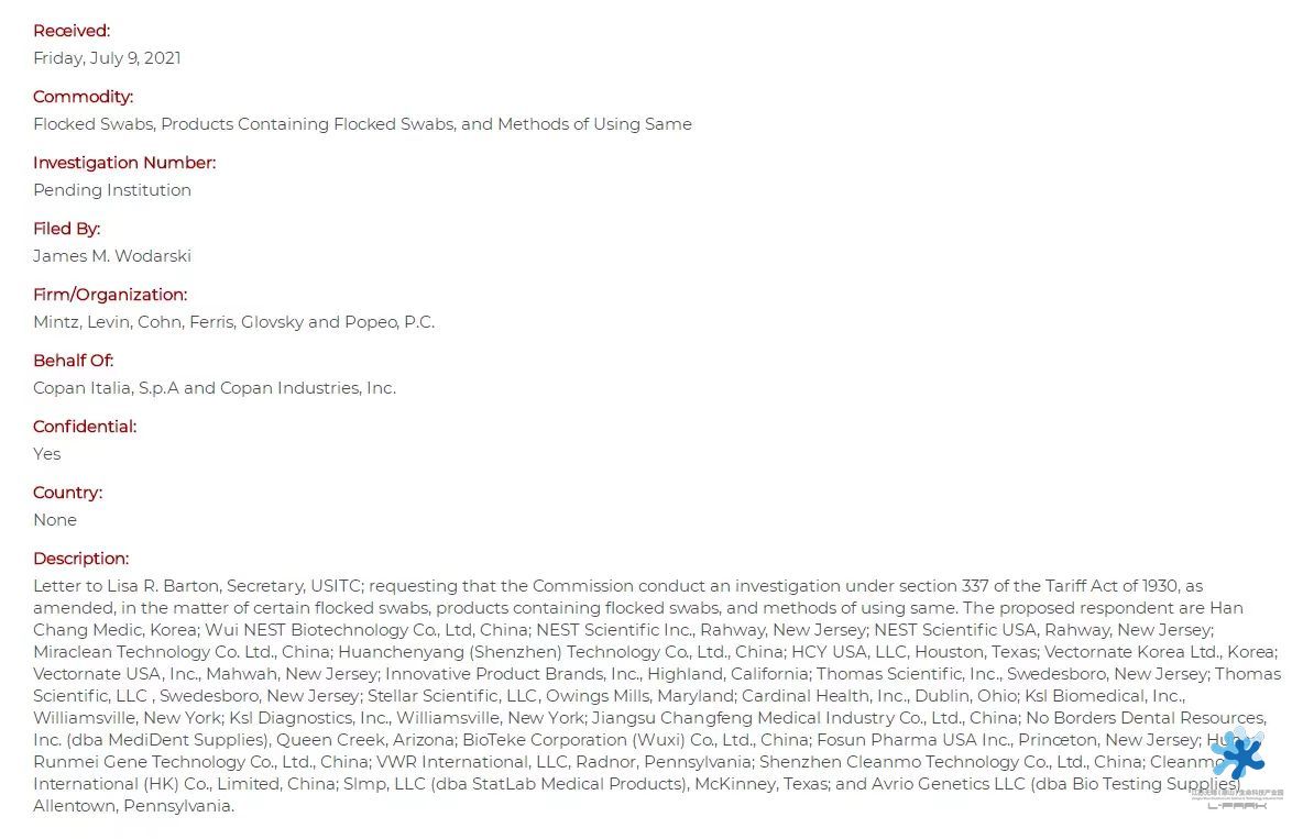 2021年7月9日,Copan根據(jù)337條款向ITC提出申請(qǐng),主張對(duì)美出口、在美進(jìn)口及銷售的特定植絨拭子及其下游產(chǎn)品和方法侵犯其專利權(quán),建議ITC列為指定應(yīng)訴方的中國(guó)企業(yè)共有8家,百泰克生物決定聯(lián)合其他企業(yè)積極應(yīng)訴。