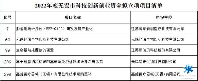 日前,無錫市科技局先后公布兩批2022年度無錫市科技創(chuàng)新創(chuàng)業(yè)資金立項項目清單。首批全市373個項目獲立項,生命園海萊新創(chuàng)、懷信生物、瑞貝科技、福陽生物、高峰醫(yī)療5家企業(yè)的項目入選;生物醫(yī)藥產業(yè)專項全市共48個項目入選,園區(qū)端源醫(yī)療、倍達醫(yī)療、康萊醫(yī)療、茵絡醫(yī)療4家企業(yè)的5項目獲立項。