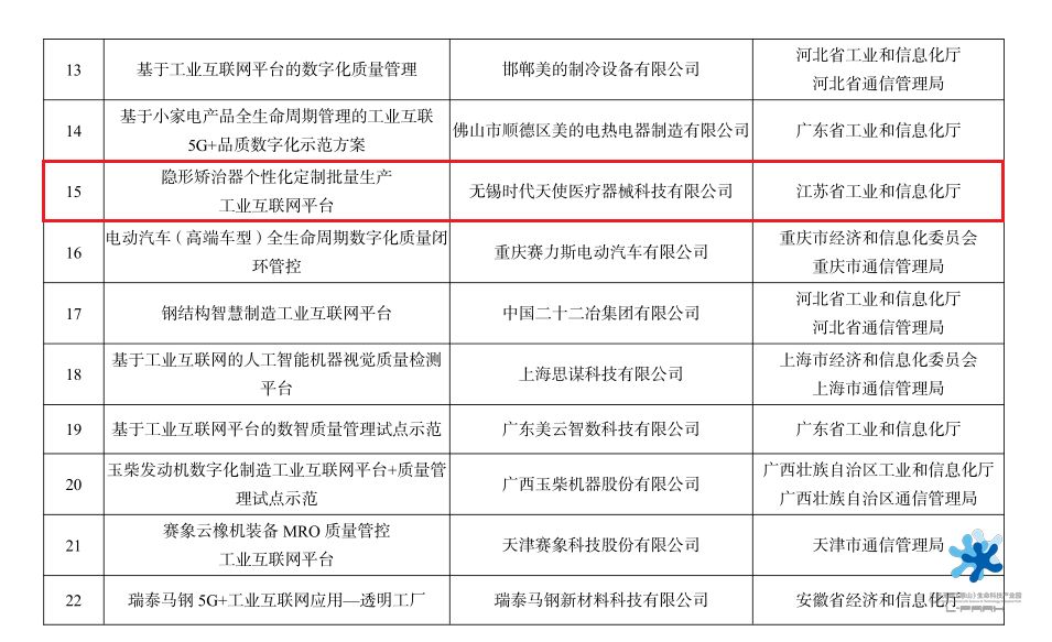 日前,國家工信部公示了2022年工業(yè)互聯(lián)網(wǎng)試點(diǎn)示范名單,無錫時代天使醫(yī)療器械科技有限公司的“隱形矯治器個性化定制批量生產(chǎn)工業(yè)互聯(lián)網(wǎng)平臺”成功入選“工業(yè)互聯(lián)網(wǎng)平臺+質(zhì)量管理試點(diǎn)示范”,為惠山區(qū)唯一,當(dāng)年度無錫共有3個項(xiàng)目入選。