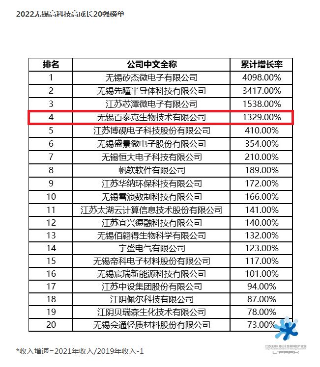 2023年4月3日,由無(wú)錫經(jīng)濟(jì)開(kāi)發(fā)區(qū)與德勤中國(guó)聯(lián)合主辦,無(wú)錫雪浪小鎮(zhèn)未來(lái)園區(qū)協(xié)辦,“2022德勤無(wú)錫高科技高成長(zhǎng)20強(qiáng)及明日之星”頒獎(jiǎng)典禮在君來(lái)世尊酒店隆重舉行,榮獲20強(qiáng)和明日之星的35家企業(yè)負(fù)責(zé)人出席接受授獎(jiǎng)?;萆缴鼒@一舉囊括頒獎(jiǎng)項(xiàng)目的1/7,其中百泰克生物上榜2022無(wú)錫高科技高成長(zhǎng)20強(qiáng),位列第4,高峰醫(yī)療、海萊新創(chuàng)、麥默真空和帕母醫(yī)療同時(shí)入選明日之星。