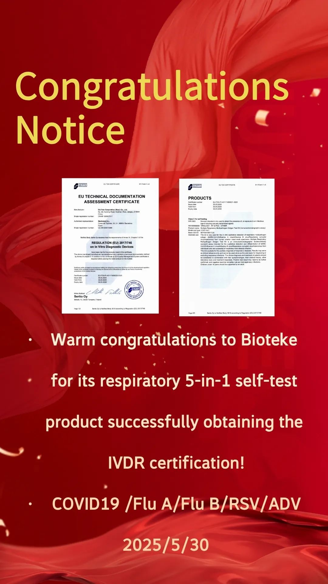 熱烈祝賀百泰克呼吸道五聯(lián)檢自測產(chǎn)品成功獲得IVDR認證