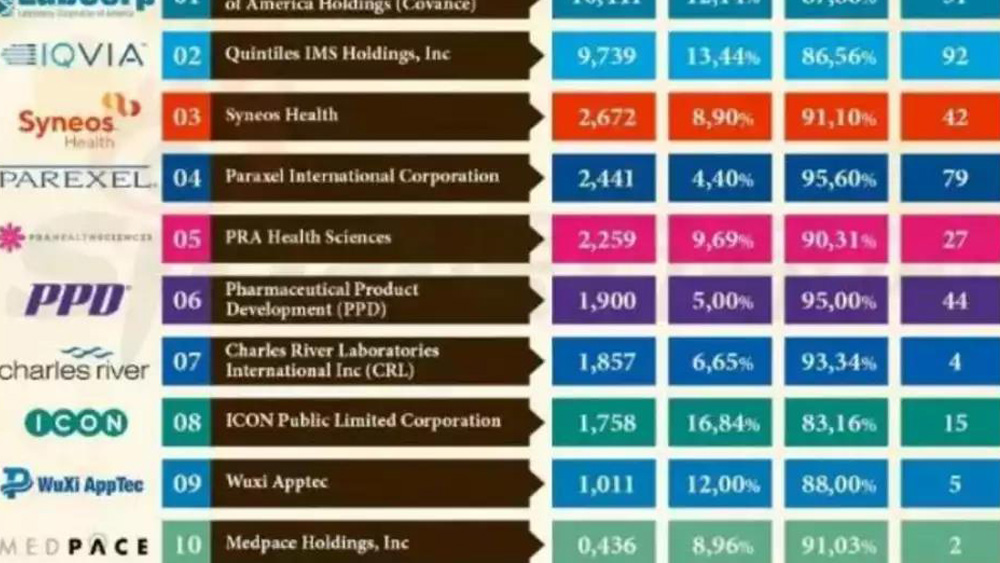 2018年全球CRO公司TOP10排名,藥明康德升至第9
