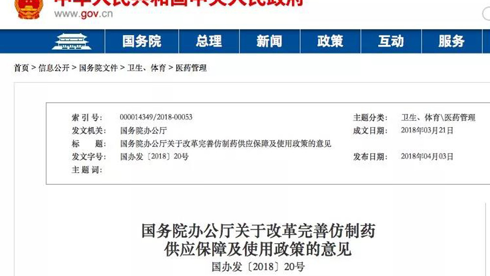 國務院辦公廳印發(fā)《關于改革完善仿制藥供應保障及使用政策的意見》