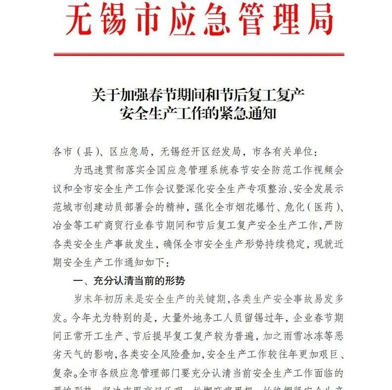 無錫市應(yīng)急管理局關(guān)于加強春節(jié)期間和節(jié)后復(fù)工復(fù)產(chǎn)安全生產(chǎn)工作的緊急通知